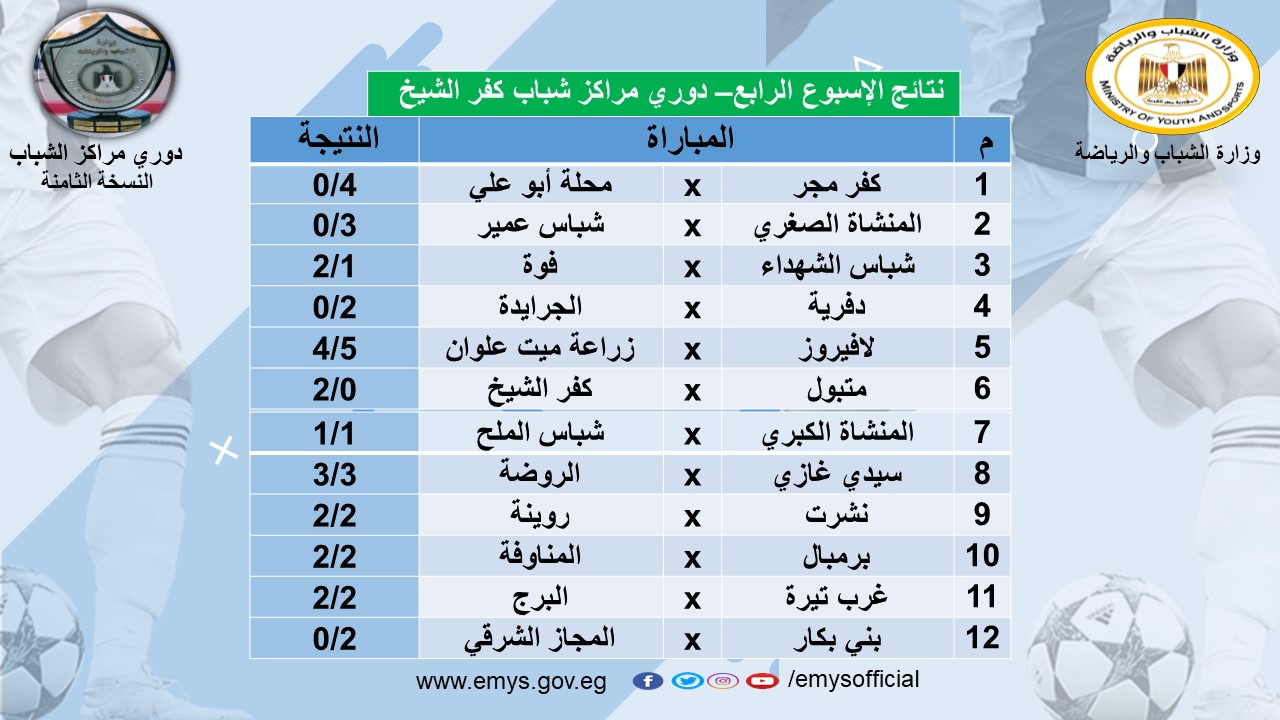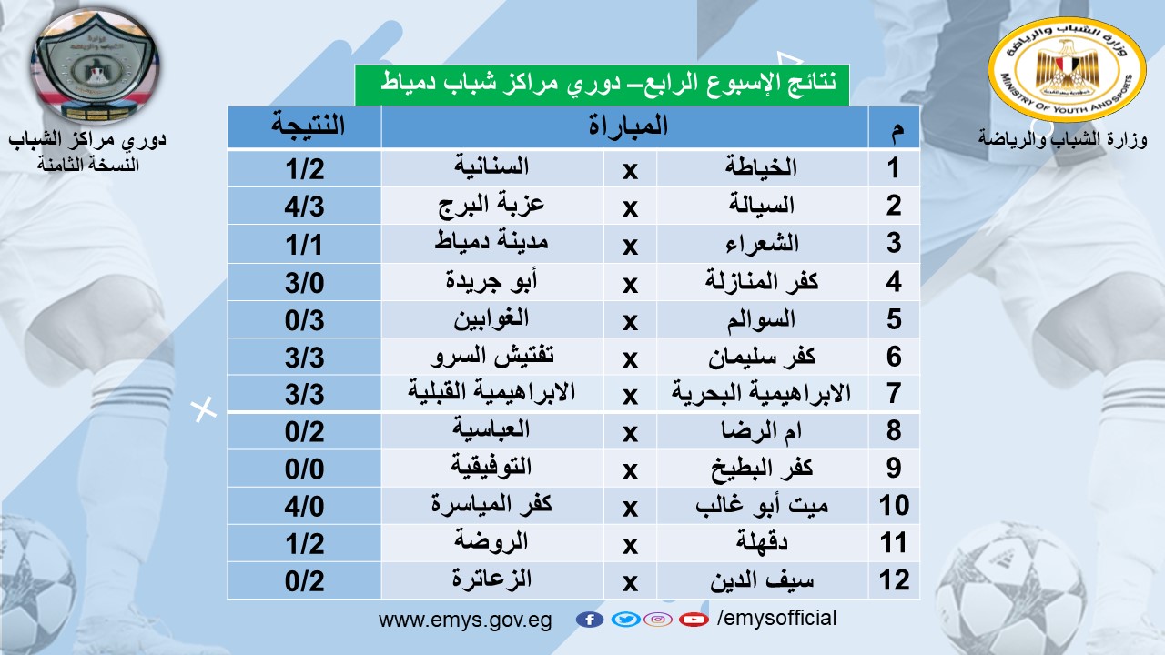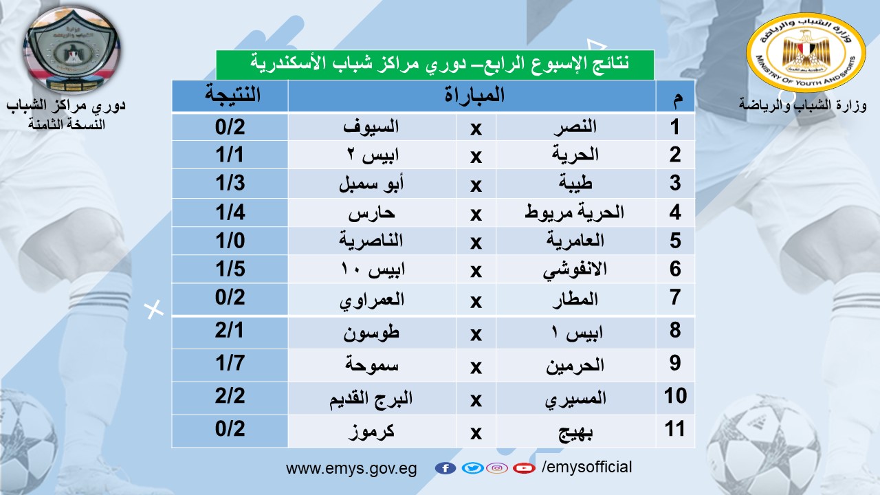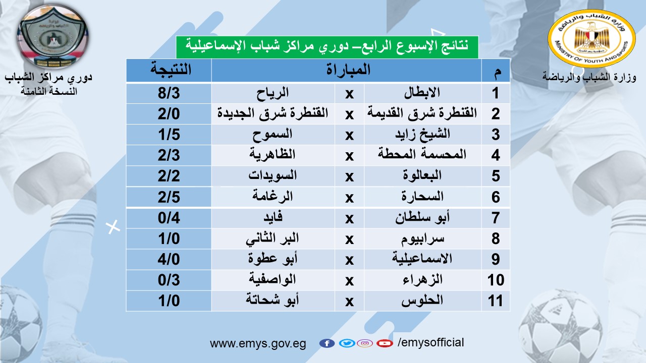 أعلنت وزارة الشباب والرياضة من خلال الإدارة المركزية لمراكز الشباب والهيئات ، نتائج الإسبوع الرابع من دوري مراكز الشباب النسخة الثامنة ، بإقامة 207 مباراة في 23 محافظة ، تحت شعار ” مصر أولاً ..لا للتعصب
